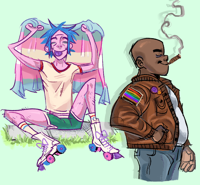 testing new brushes and once again spent way too much time on coloring so here are some doodles. gay/trans rights BABY!!!! ( gorillaz )