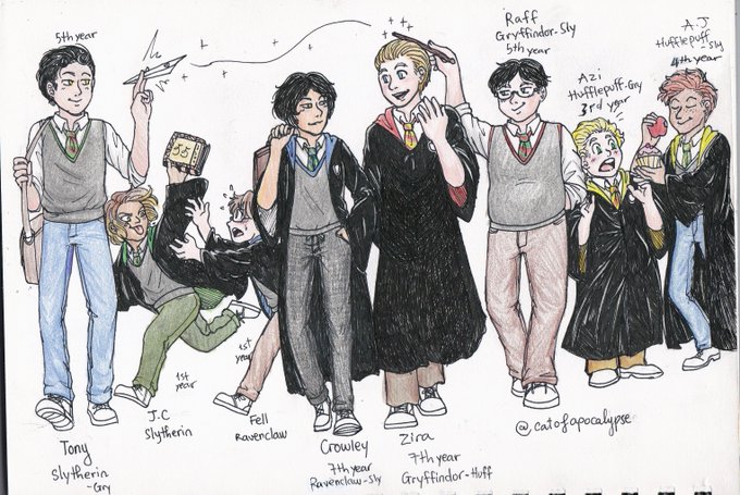 I am not very happy with the single Hogwarts House system. So they have 2 houses. A main and a sub one. They are allowed to hang out in their sub-House’s common room and join the feast tables. The House Points will go to their main house only.
