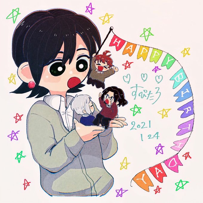 大好きなろすめの誕生日絵2021年‼️✊ 2021年は絶対3人の絵を描く!って決めてたから、有言実行できてよかった! かわいく描けたので載せておく✍💜💚❤️