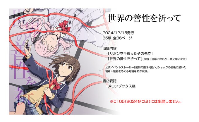 【新刊情報】プロセカ東雲絵名+暁山瑞希本「世界の善性を祈って」12月上旬発行。荊棘ショック直後にしたためた祈りの短編を二編+描き下ろしエピソードなどのおまけを急遽追加して収録した全40ページ。メロンブックスさんで予約開始しています。よろしくお願いします!