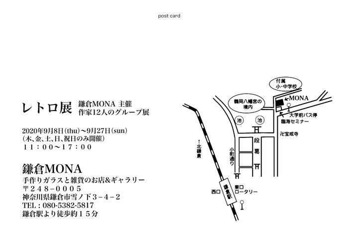 【告知】 明日9/10〜9/27日まで、鎌倉MONA様(@kamakuramona )で開かれるレトロ展に出展させていただきます。 デジタル画1点と、ポストカードを置かせていただいておりますのでお近くに寄られた際にはよろしくお願いします。また、開催される曜日が決まっているのでご注意ください*ᴗ ᴗ)⁾⁾
