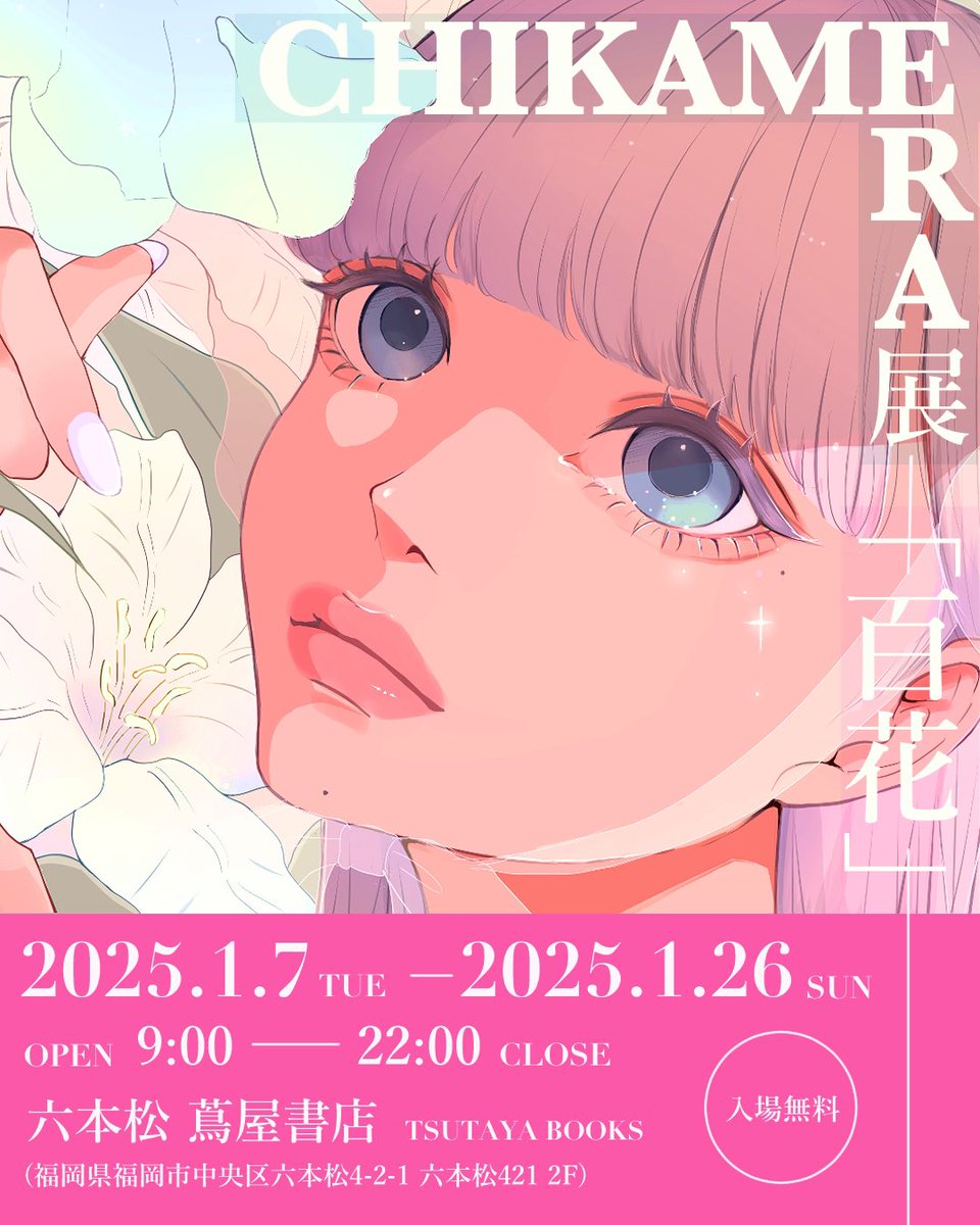 【福岡・個展のお知らせ】 CHIKAMERA展「百花」 ▪︎期間▪︎2025年1月7日(火)-1月26日(日)※入場無料 六本松蔦屋書店にて個展を開催いたします。 会場では作品約18点の展示とグッズ販売を行います。六本松蔦屋書店限定の作品集セットも販売予定です💐