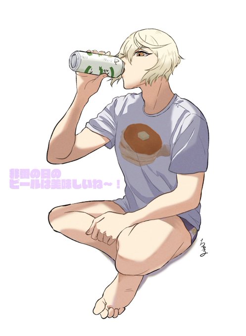 だらしなくビールを飲む弊本丸の髭切くん