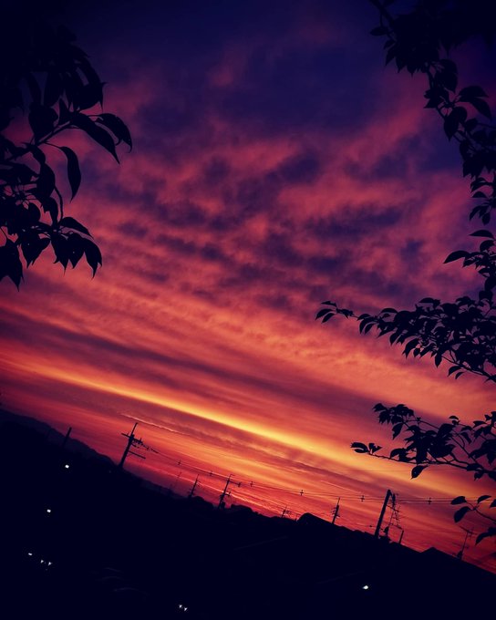 #自分で選んだ今までで最高の写真を1枚だけ貼り付ける バスの窓から見えたんで 途中下車して撮っちゃいました。 年に1回遭遇するかしないかの 怖いぐらいの紅の空。
