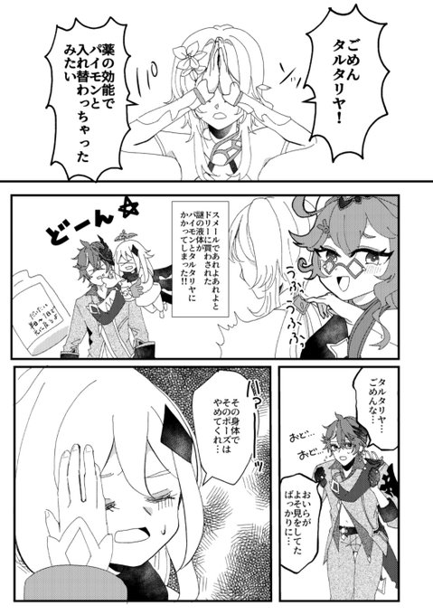 神ノ叡智2023にて頒布予定のタル蛍本のサンプルになります~! 『タルタリヤとパイモンが入れ替わる話』 全年齢 A5-36P 400円(会場価格) タル蛍+パイモンのギャグ本です #タル蛍 #chilumi (1/2)