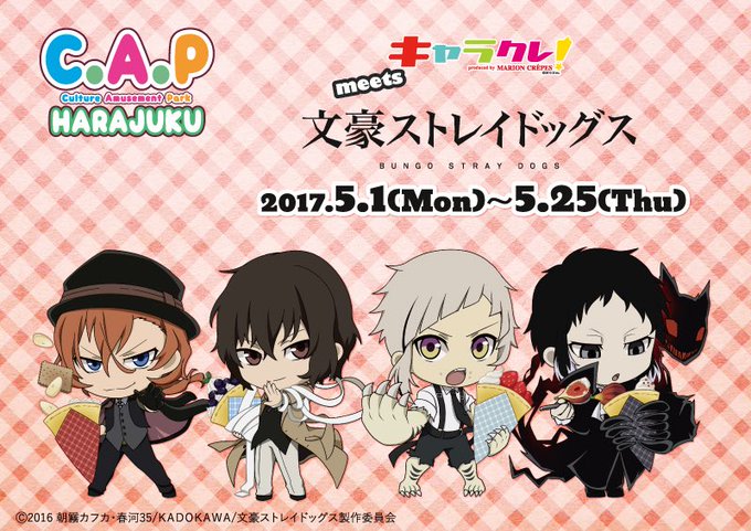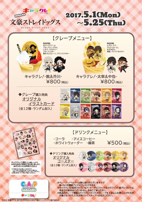 【キャラクレ!C.A.P原宿店 コラボ情報】5/1(月)~5/25(木)期間限定!キャラクレ!C.A.P原宿店にて「文豪ストレイドッグス」コラボ第三弾決定ほんクレープメニューが新しくなり、キャラクレ!限定イラストもキャラクターが追加され再び登場!