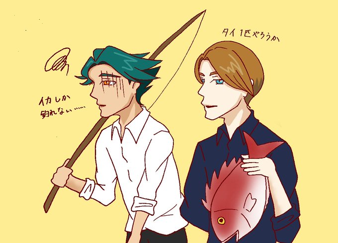 レアな魚釣りまくりのキューエルと一向にイカしかヒットしないジェレミア。(どう森ネタ)
