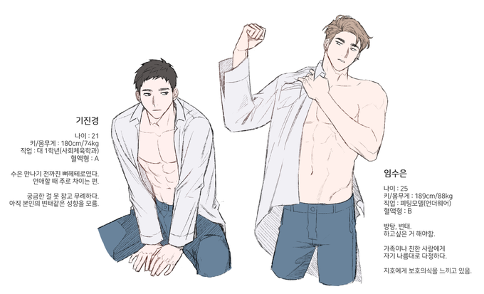 휴재공지가 지워졌길래 캐릭터 프로필 다시 업데이트 해봅니다🤗(똑같은 내용이에요!) 마지막 그림은 지금도 참고해서 그리고 있는 초기 캐릭터시안 입니다. 예전엔 포토샵을 주로 이용했고, 지금은 클튜로 작업툴이 바뀌어서 그림체가 많이 단순해졌네요.😥