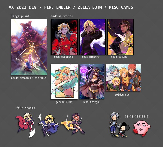 #AX2022ArtistAlley ax catalog continued! final fantasy (14, 7, 12) games (botw, fe3h, golden sun) anime manga (fma, dunmeshi, spyxfamily, promare) misc (arknights, houseki no kuni, etc) 2/2
