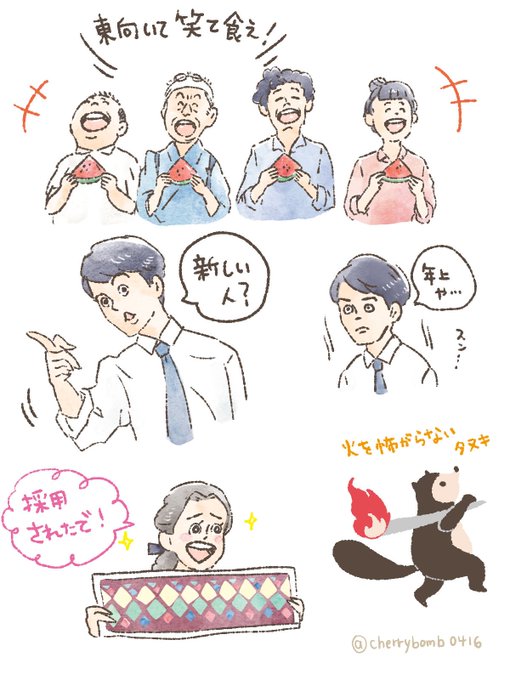チーム・フカの初物スイカ食べてるとこ、ご利益ありそうな絵面!信作、十代田さんが年上じゃなかったらこのテンションで応対してたんだろな…。照子はほんと「喜美子への福音はうちがもたらしたる〜!!」感があってええな〜(採用されたで!の前のツン含め)#スカーレット #スカーレット絵