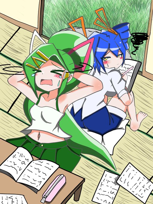 宿題が終わらないと嘆く少女と、それに渋々付き合う友人。 #イラスト #うちのこ #1日1絵