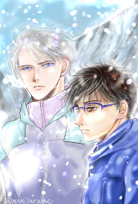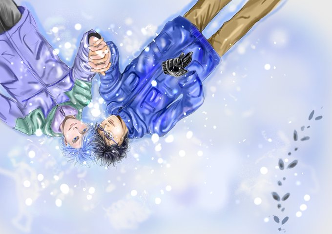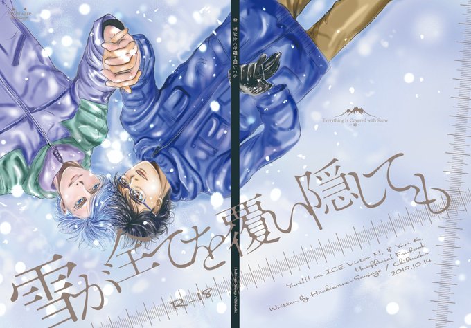 表紙の話。もはや無い方がマシなレベルの私作謎絵(1枚目)と「雪原の上で、勇利とヴィクトルが頭くっつけて幸せそうな顔で寝そべってる」という指定(文字だけで良かったよね)に対して、まきねえさん(@makisuzume)が神がかり的にイメージを汲んで下さり(2枚目)、最終的にこんな素敵なイラスト(3枚目)に💖