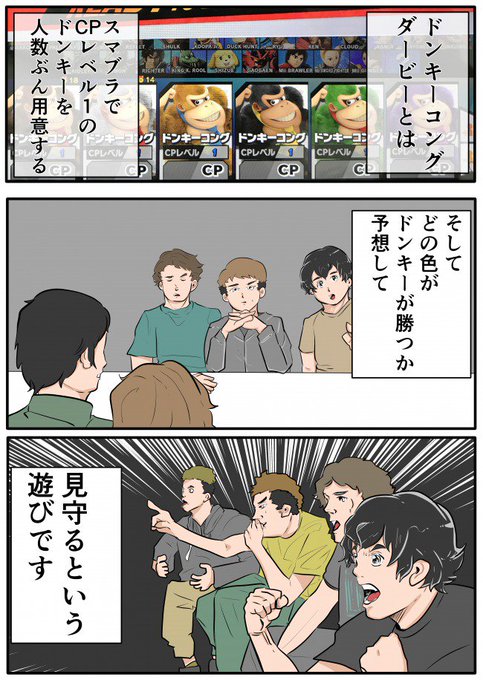 「LV1のコンピュータのドンキー6体を戦わせて見守る」というルール、初心者も上級者も関係なくスマブラに触れられるという意味では画期的な発明かもしれない。しかもやってみたら意外にも盛り上がったのでオススメ