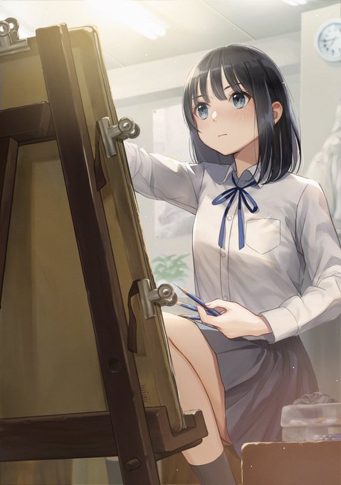 こだわりポイントは、ボケてほぼ見えないけど壁に貼ってあるデッサンに 私が高3の時ほんとに描いたデッサンを使ったところです₍ᐢ- ̫-ᐢ₎(※顔にモザイクかけてあります)