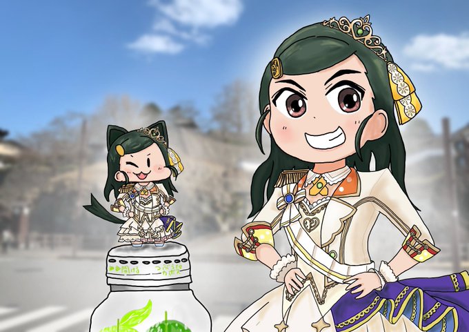 とにかく頭の髪飾りも可愛いし、うなじに毛がぴょこっとしてるの珍しいし、笑顔が眩しいイラスト https://t.co/YwvKQwLbGc