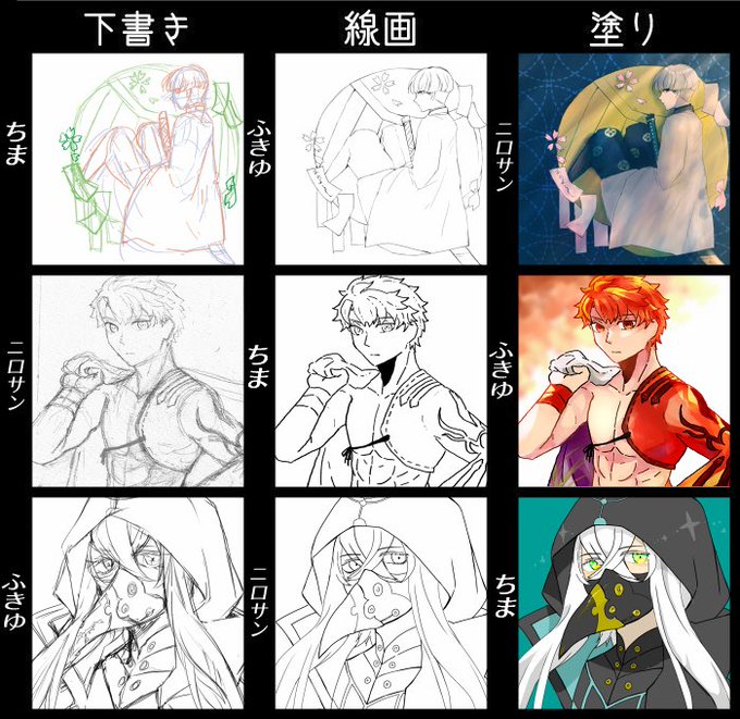 ふきゆちゃん(@hky_fgo )とにろさん(@2KanakI6 )と下書き、線画交換するやつしてました。めっちゃスムーズで笑っちゃった( ˙꒳˙ ) ありがとうございました!楽しかった!