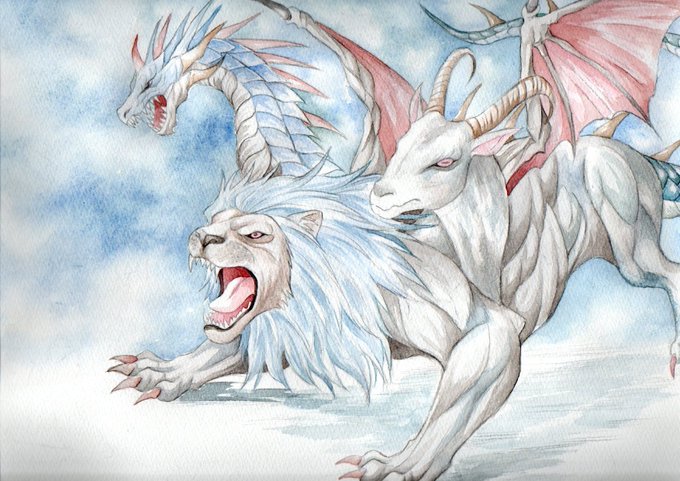 #アナログイラスト #透明水彩 #キマイラ すみません少し加筆しました。 ちょっと格好良く描けました🐲🦁🐐
