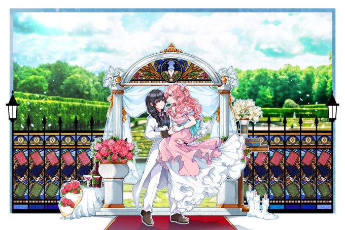 첫 고정틀 MD 커미션 배경의 스테인드글라스를 커플의 특징에 따라 디자인해드립니다 장미색, 와인색 등등 변경 가능합니다 그리고 구도도 다르게 가능하고 옷 디자인도 해드립니다 ...이럼 고정틀이 아닌가?