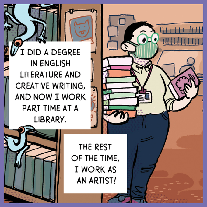 This panel is from @EllJWalker's "About the artist" intro comic for "Working in: The Arts"! ✨