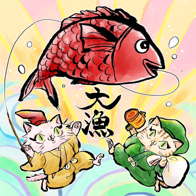 アンティークカフェ掲示用ポスター。 50×50cmの大きめの和紙に印刷の上お渡しでした。 海に縁があるので恵比寿様を…とのご依頼でしたので、2匹の看板猫ちゃんをモデルに恵比寿様と大黒様のペアでご提案しました✌️🐈🐈