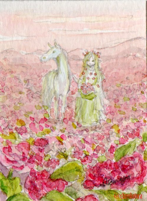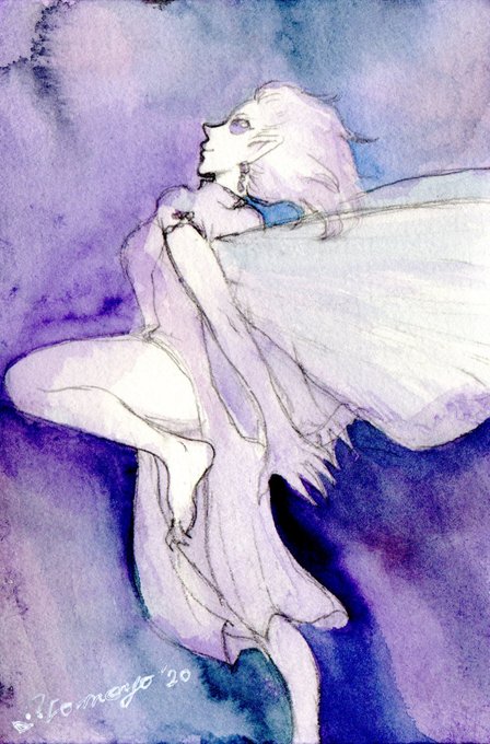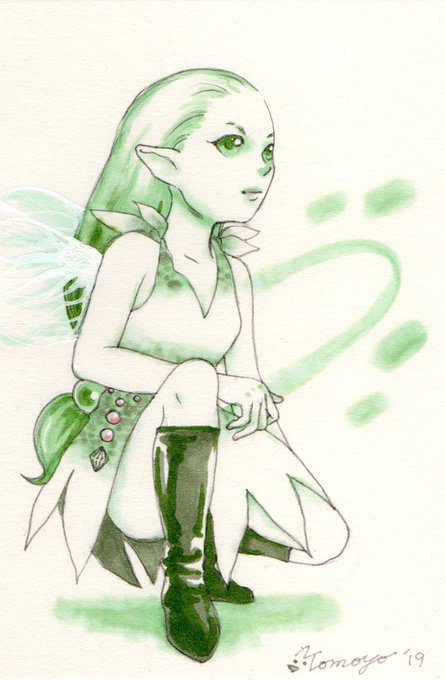 ハガキサイズ、妖精イラスト。妖精をテーマにしたスケッチ。普段やらないこととして今回は、いくつかの透明水彩メーカーを混ぜて使用してみました。
