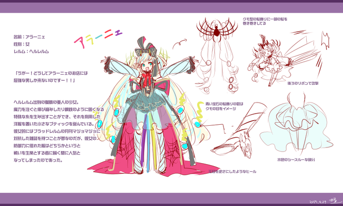 #ラスピリイラコン新デザ ヘルレルムに意外と蜘蛛の亜人の子はいなかったよなぁ…と。 デザイナーとパタンナーの両方をこなす ファッションデザイナーちゃんですヽ(´▽`)/ 属性は光でタイプはディフェンダーあたり。