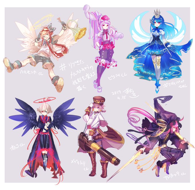 #リプきたメルストキャラの性別を変えて描く できました~。いただいたリクエストは メグラトテ、ギフティペペ、ピコニィ、アトリトッテ、オルコ、ハルモニカ でした!ありがとうございました(*´ω`*)