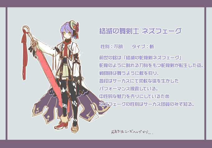 #千メモ3_オリジナルリターナー募集 リターナー名:絡滅の舞剣士ネズフェーグ タイプ:斬 性別:不明 ペンネーム:まっちょこ 蛇腹剣はロマン武器!!