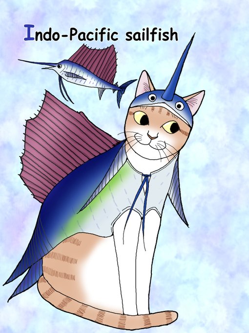 『変身にゃんこのABC・海魚編』Indo-Pacific sailfish(バショウカジキ) スズキ目マカジキ科 バショウはバナナの古い呼び名で、背びれがバショウの葉に似ている事にちなむ 魚としては最速の、時速100キロで泳ぐという報告がある カジキの中では安価で加工よりも刺身で食べる事が多い #カジキ