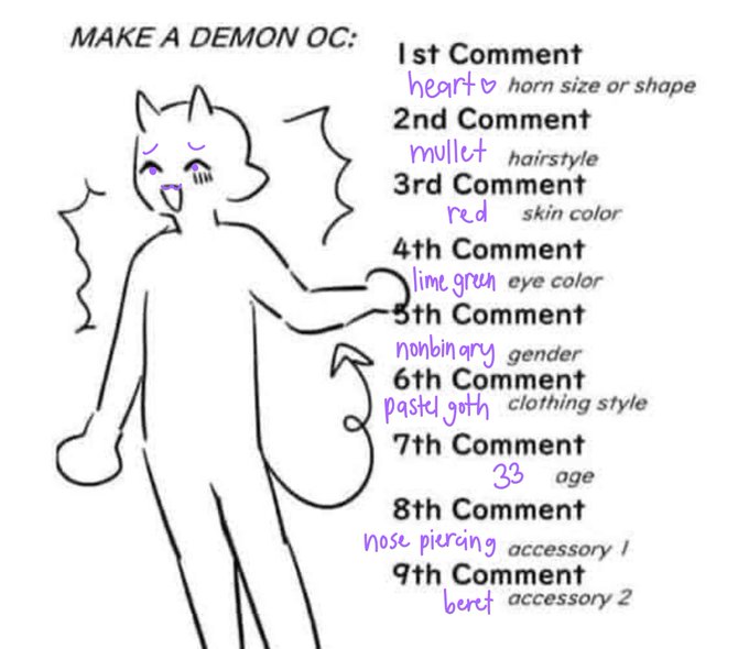 make a demon oc meme!! goes by they/he and ??? maybe they design succubus/incubus fashion :3 thank u to everyone who participated!