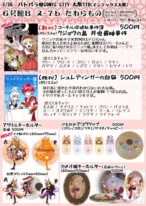 3/26バトパラ@大阪インテのお品書きできました!本のサンプルやグッズの簡単な紹介はリプに続きます。おになまこ(@0N1NAMAK0 )と2人で「6号館B ヌ7b たわらもの」でお待ちしております!よろしくお願いします!!