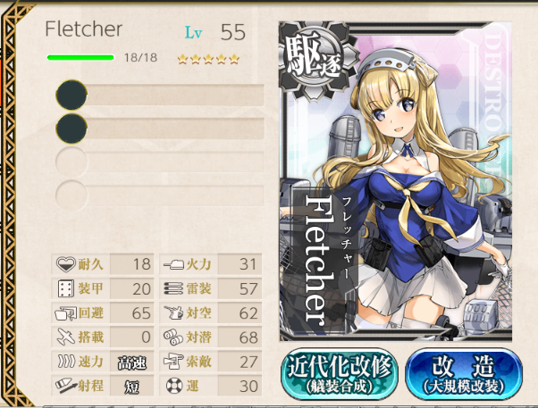 二人目のフレッチャー、改造レベル到達♪ 開発資材80個は重いけど・・・ グラはこっちの方がかわいいのでこのまま保持の予定☆