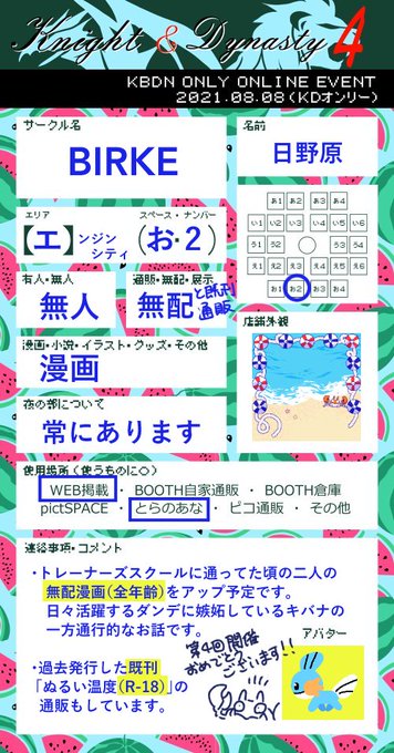 毎回ギリギリの告知ですみません…😹 明日【エ】お・2にてスペースいただいてます! 卜レ_ナ_ズスク_ノレに通ってた頃の学生kbdnの全年齢漫画をup予定です。日々活躍しているdにkが嫉妬しているk→dなお話です。 既刊の通販も行います。よろしくお願いします🌺🏝🍍 #KDオンリー4