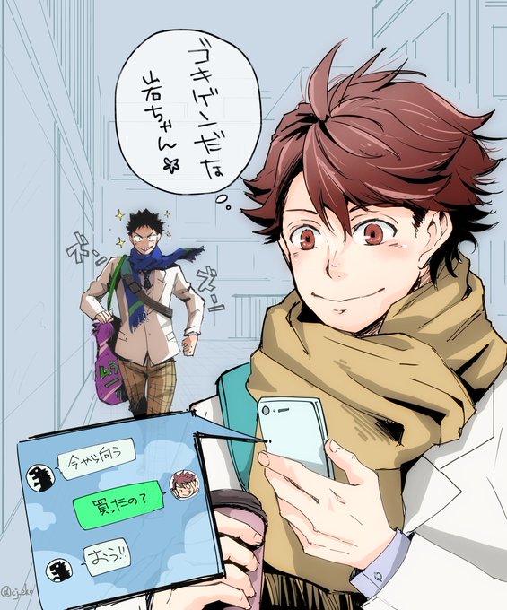 いつぞやの放課後?のグッズ絵あれ。阿吽一緒じゃなかったけどこうなんやろ?と妄想捗ったやつ😄 岩ちゃんがご機嫌で嬉しい及川さんと早く見せたい岩ちゃん