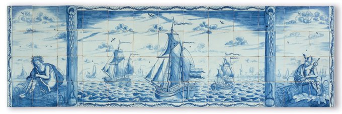 Utterly glorious #seafever c.18 Delft mural; inland vessels, coasters & frigate; Mercury, God of fcommerce, travellers, luck & Aeolus, keeper of winds. Dutch, painted by Adam Sijbel, prob. purchased by John Webbe Weston in 1784 & from Sutton Place, Surrey