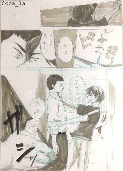 哲純で「キスするとでも思ったか?」というのを哲さんにやったら逆に壁ドンちゅーされる純さん。というネタお借りして描かせていただいたやつ。 すでに台詞が違ってますが…