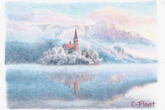 水彩色鉛筆2枚目。均一に塗るのが難しい。柔らかい筆を使うとか、水を多めに使った方がいいのかなぁ?#水彩色鉛筆 #色鉛筆 #Watercolor #風景画