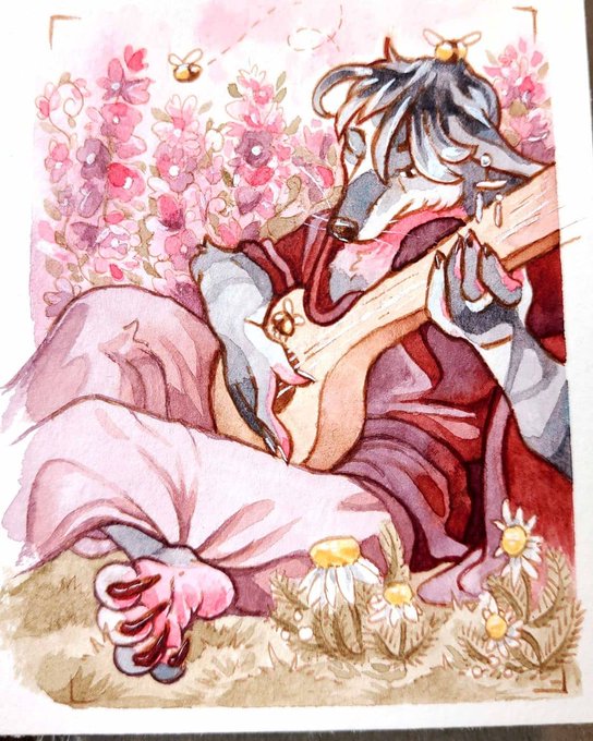 Watercolor WIPs for the Fritz & Aux art card: Background, Shading, Highlights, and of course the final atc!