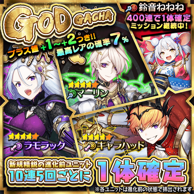 「ラモラック」「マーリン」「ギャラハッド」が新登場のGODガチャは11/13(金)17:59まで開催中💥排出されるユニットは全て「+1~2」で排出されますのでこの機会にぜひ✨😆✨