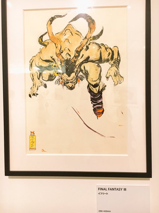 滑り込みセーフ!!!で天野喜孝展行ってきた!クジャ前で写真撮りまくり大満足。歴代のロゴやパケ画、近くで観れるのはイイ。。イフリートにタイタンと書かれてたけど、元はタイタン用だったのかな。 #FF天野展