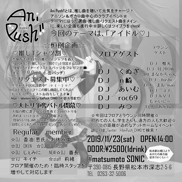 11/23(土)はAnipush!! Vol.5にてラウンジでDJします!前回パワータイプな選曲をした分、今回はスローテンポア二メミュージックをやりたいです。