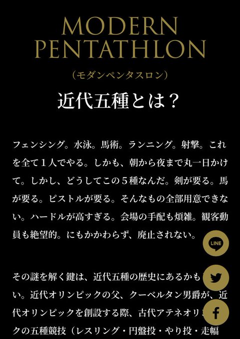 近代五種とはこれのことだね…!1人の選手が1日の間に、フェンシング、水泳、馬術、レーザーラン(射撃、ラン)というそれぞれに全く異質な5種類の競技に挑戦!キングオブスポーツ!(画像は日清食品の応援サイト)