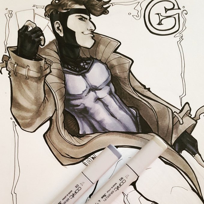 Comfort is working on a #gambit and #Deadpool @copicmarker sketch- gonna be a cool playing card thing!