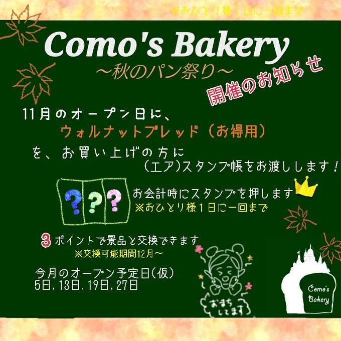 #コモズベーカリー 明日のお知らせ🍞 22:00〜開店予定です♪シャキ待ちに、お散歩がてら、ただ見に来ただけ、夜食選びに、コンテンツ後のまったりタイムに…お越しください(^ω^) ミストアパルトメント拡張12区42号 (おねだんはマケボ確認後なので来店後メニューご覧ください)