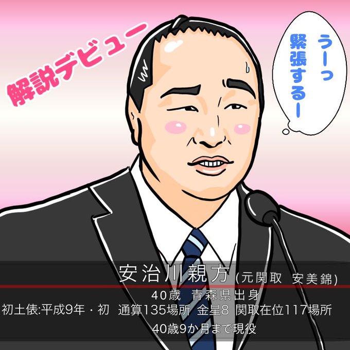 安治川親方✨解説デビュー㊗️ 素晴らしいですよ☺️👍 舞ノ海さんとの津軽弁でのやりとり期待しております😊 #力士絵 #安治川親方 #安美錦 #イラスト