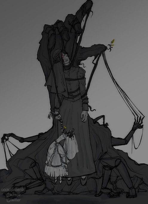 I drew a mutated form Donna Beneviento since the game didn't give her one. Design inspiration came from mannequins, trees/plants, those dolls hanging from nooses, and a reversed puppeteer theme. Junji Ito, too!