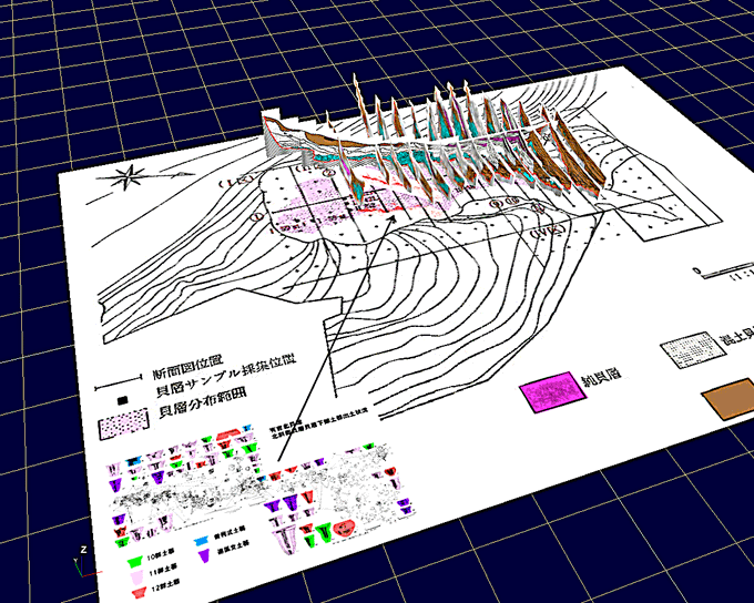 有吉北貝塚北斜面貝層について思考するための補助ツールとして、情報図を試作しました。