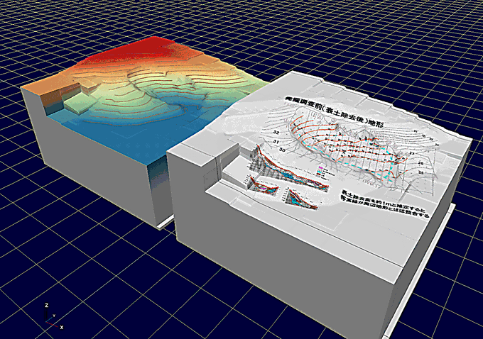 有吉北貝塚北斜面貝層の発掘調査前地形を分析作業で作成した等高線から3Dモデルにしました。表土を剥いだ状況が良くわかります。この試作が成功しましたので、貝層形成直前地形なども3Dモデルにすることにします。