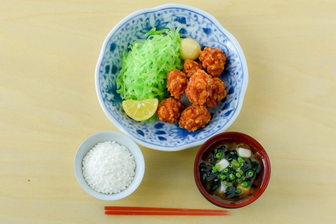 最近のお気に入り、からあげ定食を食べてるところを描いてくださいました!ちゃんとお箸にからあげもっててかわいい😍🥢