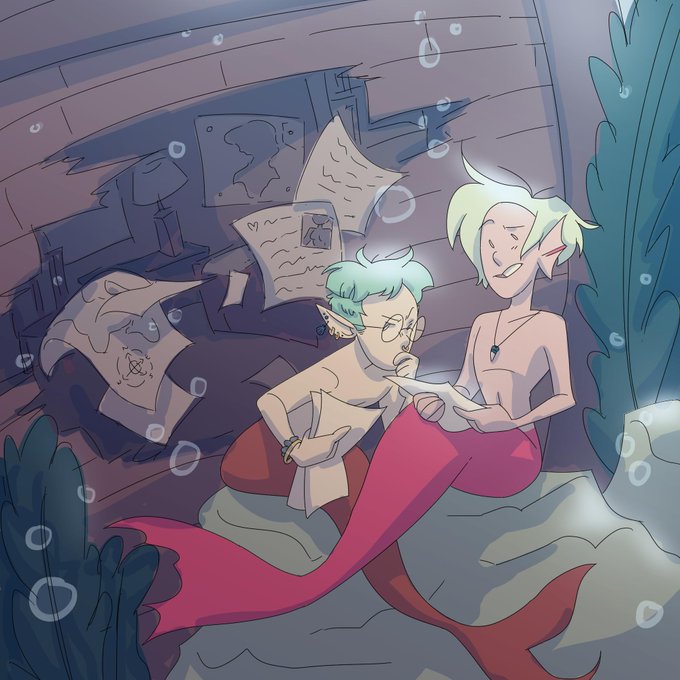 #mermay2019 day 1, featuring a rendition of me and @apollinares looking over some sonic fanfiction from an abandoned shipwreck #art